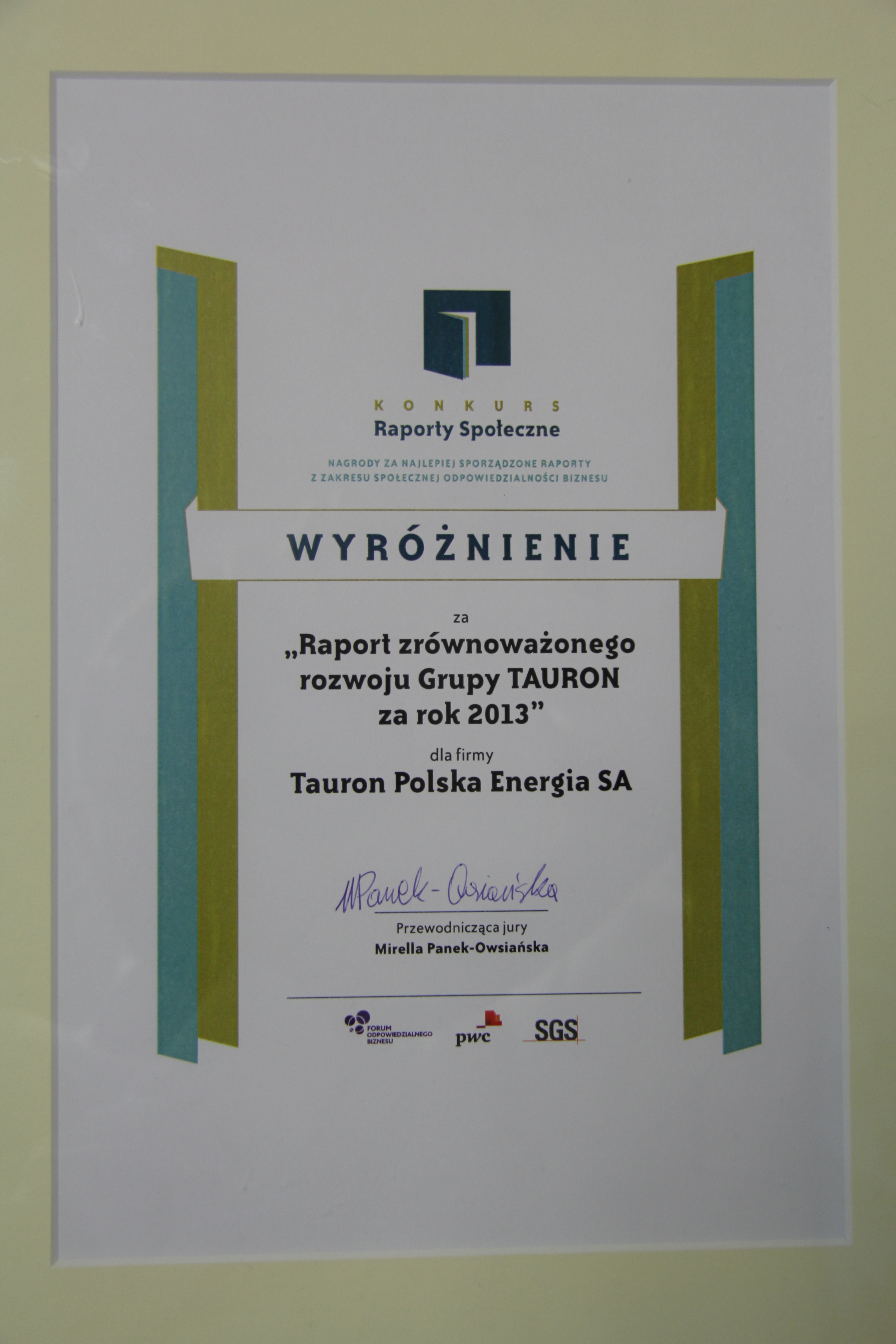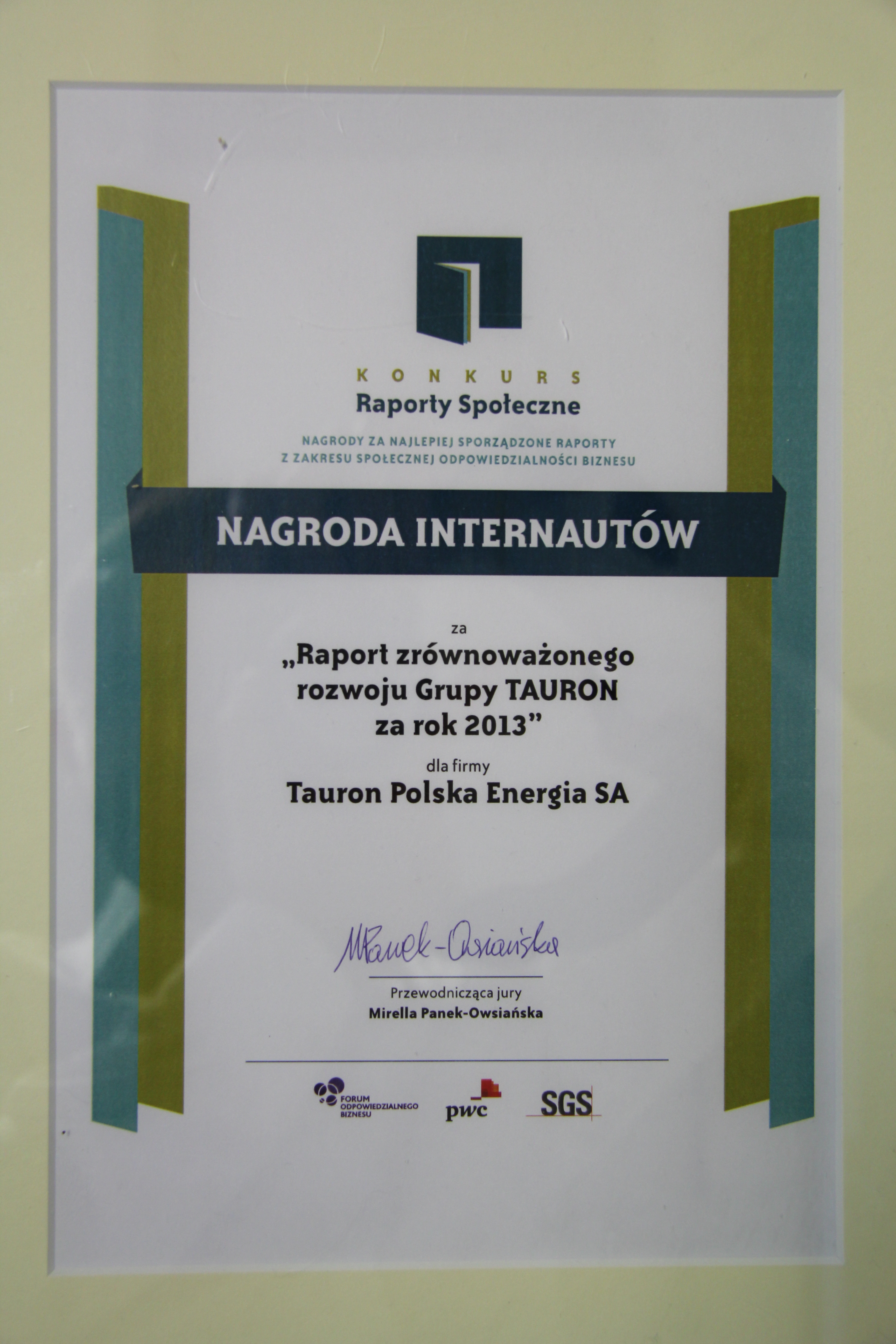Watro przypomnieć, że w październiku br. TAURON otrzymał od kapituły konkursu „The Best Annual Report 2013” nagrodę główną za raport roczny Grupy TAURON za 2013 r. Spółka otrzymała również wyróżnienie za raport roczny w Internecie.